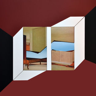 'room(s)', magazine paper fragment and acrylic paint on crescent board, framed white, 31" x 31"